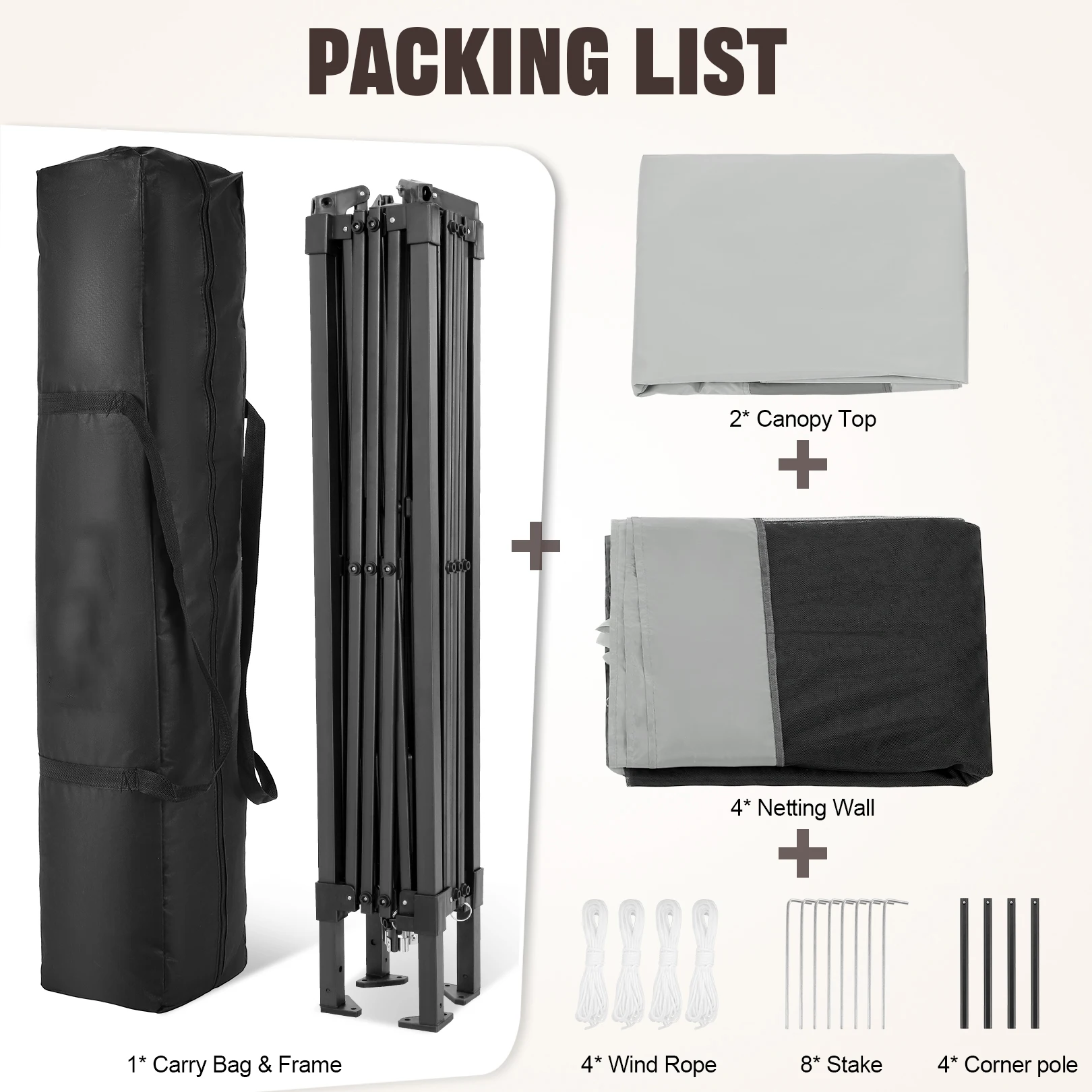 【Packing List】: 12×12 gazebo tent have a Storage Bag size is 49.2 x 8.46 x 10.43in (125×21.5×26.5cm), 2 x Canopy top, 4 x Zipper Mesh tent, 8 x Stakes, 4 x Ropes, 4 x Sandbags, 1 x Adjustable metal frame, 1 x 450D Oxford storage bag. Complete range of accessories and delivered to your home in a single parcel.